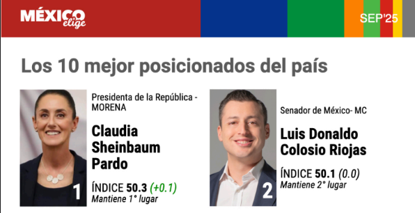 En su medición de septiembre 2025, la encuesta nacional de opinión pública de México Elige colocó nuevamente a Claudia Sheinbaum Pardo en el primer lugar de los políticos mejor posicionados del país. Sin embargo, la sorpresa vino en el segundo sitio: Luis Donaldo Colosio Riojas, actual senador y exalcalde de Monterrey, quien se consolidó como la figura opositora con mayor respaldo ciudadano, a tan solo dos décimas de la presidenta.