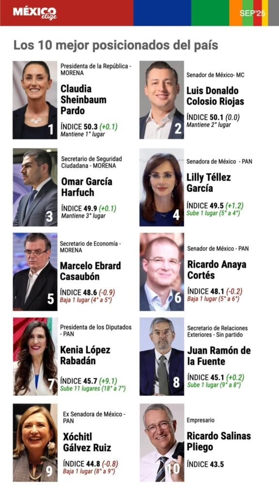 El listado de los diez políticos mejor posicionados lo completan Omar García Harfuch, Lilly Téllez, Marcelo Ebrard, Ricardo Cortés Anaya, Kenia López Rabadán, Juan Ramón de la Fuente, Xóchitl Gálvez y Ricardo Salinas Pliego (lo que también da una sorpresa y a lo que habría que poner atención). No obstante, ninguno de ellos rebasa la barrera del 50% que hoy concentra la presidenta y el senador naranja, hijo del excandidato presidencial de 1994.