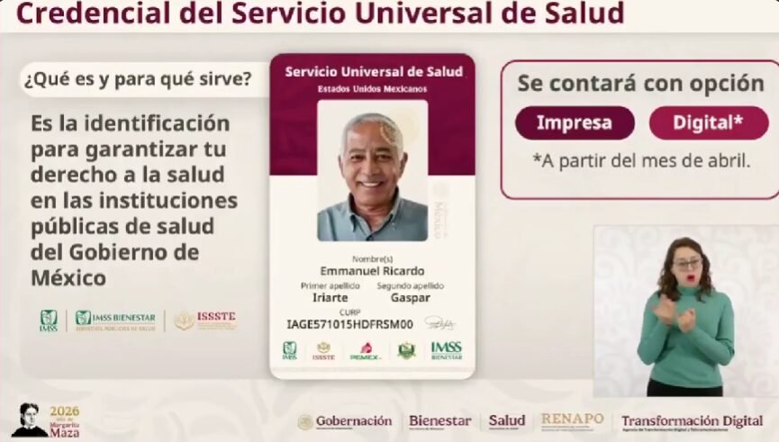 El subsecretario detalló que la credencial permitirá el acceso a los servicios del IMSS, ISSSTE, IMSS-Bienestar, institutos nacionales de salud, servicios médicos de Pemex y de las Fuerzas Armadas, es decir, a toda la infraestructura de salud del Gobierno federal. La versión física podrá portarse como una identificación, mientras que la versión digital estará disponible a partir del mes de abril mediante una aplicación móvil, lo que permitirá mantener la información actualizada en tiempo real y acceder a los servicios aun cuando no se tenga el plástico a la mano.