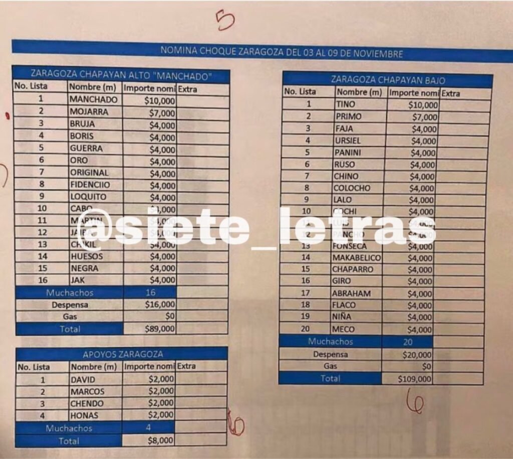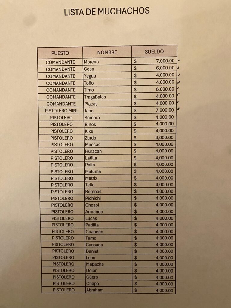 La denominada “narconómina” también enumera pagos mensuales a halcones —encargados de vigilar movimientos de autoridades y grupos rivales— y a sicarios asignados a distintas células. Los montos varían según la jerarquía y la responsabilidad operativa. En algunos casos, se consignan bonos extraordinarios o compensaciones adicionales por “eventos” específicos, lo que sugiere una lógica empresarial trasladada a la dinámica criminal.